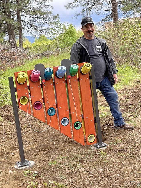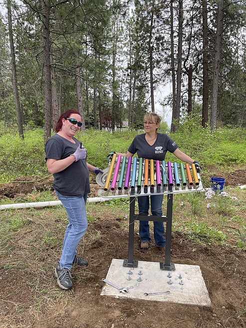 Last summer, Gizmo hosted a summer camp and about a dozen of the camp attendees designed and built the instruments, Erin said. Deming Industries of Coeur d’Alene anodized the metal, producing varied bright colors. Lake City Powder Coating treated all of the instrument bases, she said. Gizmo had prepared the cement pads for the instruments and dug the trench for the speaker phone ahead of time, so the rest of the installation could happen in one day.