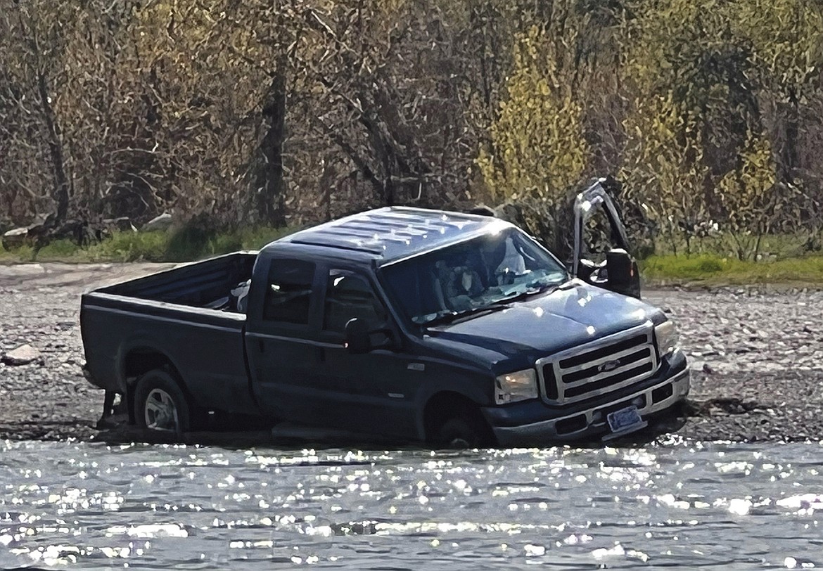 The pickup, according to cell phone photos provided to the Hungry Horse News following the May 21 incident, had local plates. It wasn’t completely in the water — just the front end was stuck.