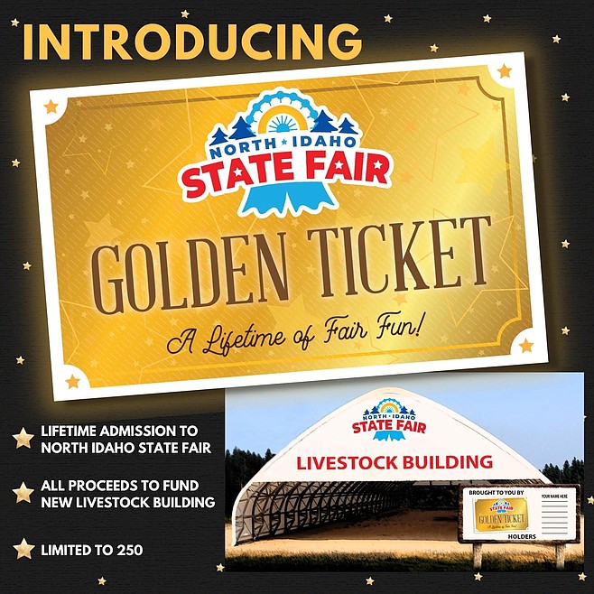 COEUR d’ALENE — For a limited time, North Idaho State Fair-goers will have the option to purchase a Golden Ticket for lifetime admission to the largest fair in North Idaho. All proceeds from Golden Ticket sales will go to funding a new, much-needed Livestock Building at the Kootenai County Fairgrounds.