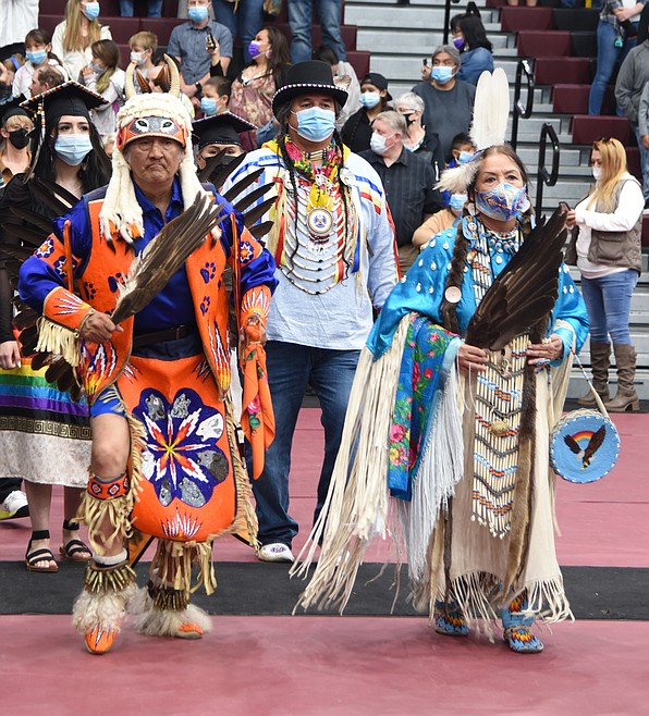 The processional was led into the Joe McDonald Health and Fitness Center by Michael Kenmille and Linda King, both wearing traditional native regalia. As the Chief Cliff drummers played for the Grand Entry, several of the students, also dressed in native regalia, dance stepped into the gym.