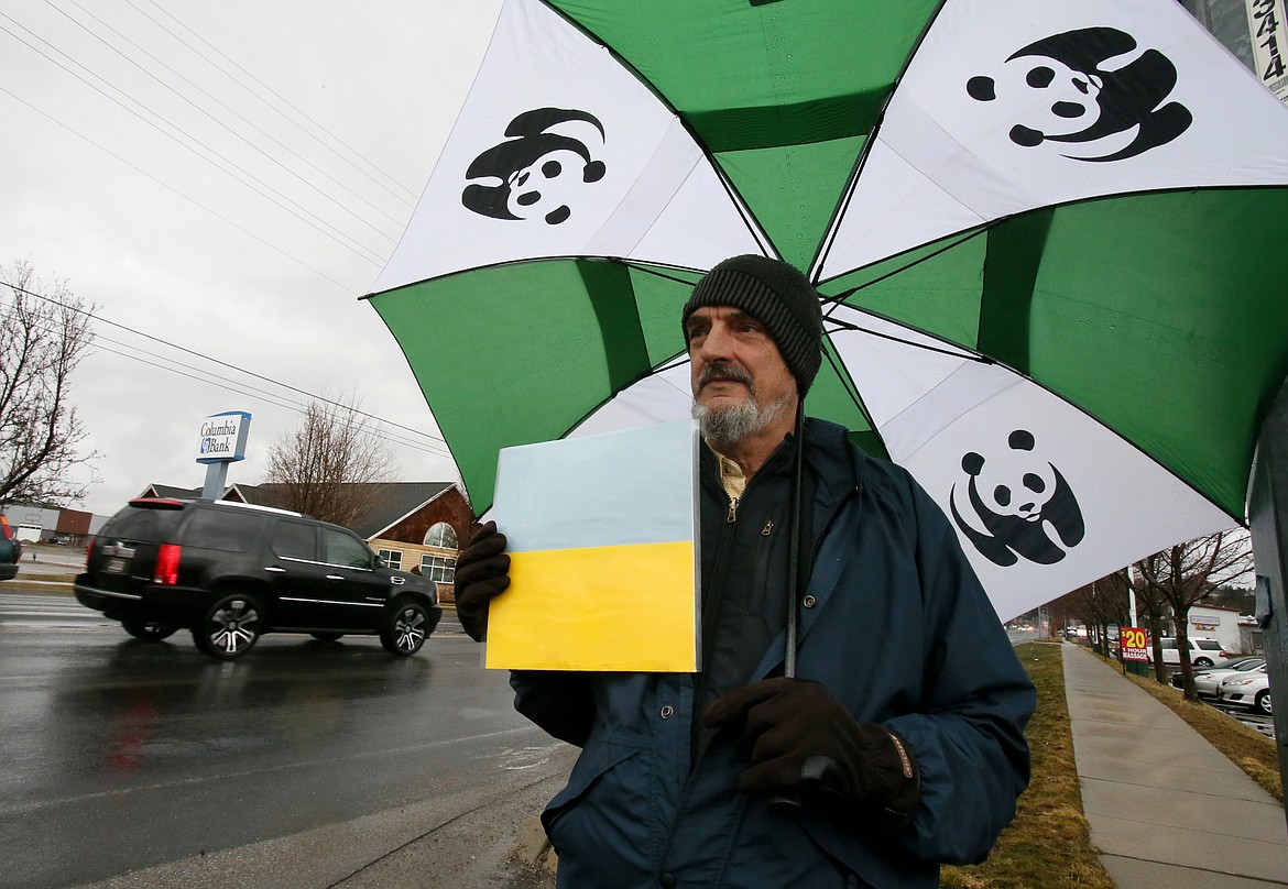 POST FALLS — One man stood in the rain Monday afternoon, holding an umbrella in one hand and the colors of Ukraine in the other.