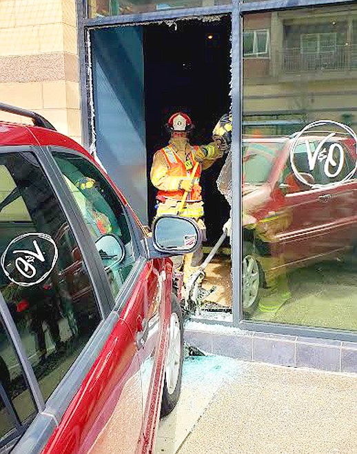 A red SUV went over the curb and a shrub before it crashed into a window and wall when the driver tried to park in front of the restaurant just after 11 a.m.