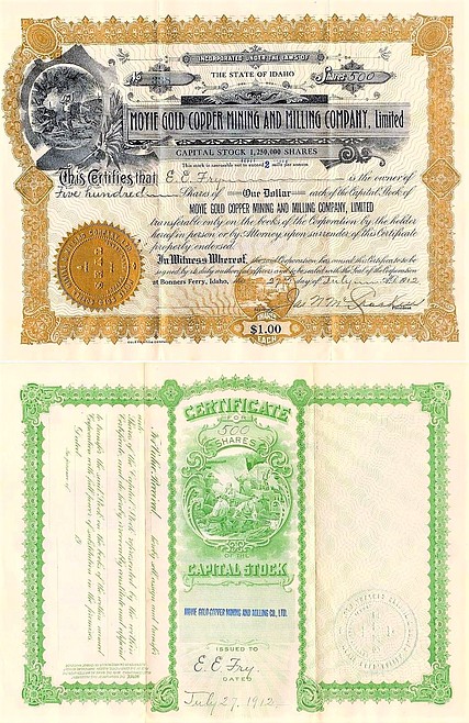 The Moyie Gold Copper Mining and Milling Company, Ltd was incorporated on Sept. 16, 1911. President Reid and Secretary-Manager Crocker, eager to have investors, sold 25,000 shares at $1 each. Dr. Ezra Esher Fry purchased 500 shares on July 27, 1912. The properties, under development for the company, were known as the Queen and Damon groups with thirteen unpatented claims.