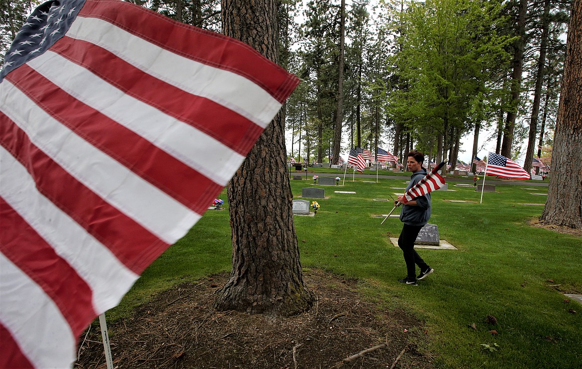 POST FALLS - With 600 flags fluttering in the wind at Evergreen Cemetery, Angela Hatch walked along, looking to place one more at a veteran’s gravesite.