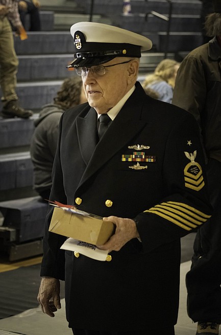 Chisholm then introduced the high school band, which played the Star-Spangled Banner. All attendees stood while each of the honored veterans stood at attention with arms raised in the traditional military salute. Following the Star-Spangled Banner the band played each of the Armed Forces Salute songs. The junior high band continued the program with the song America the Beautiful.