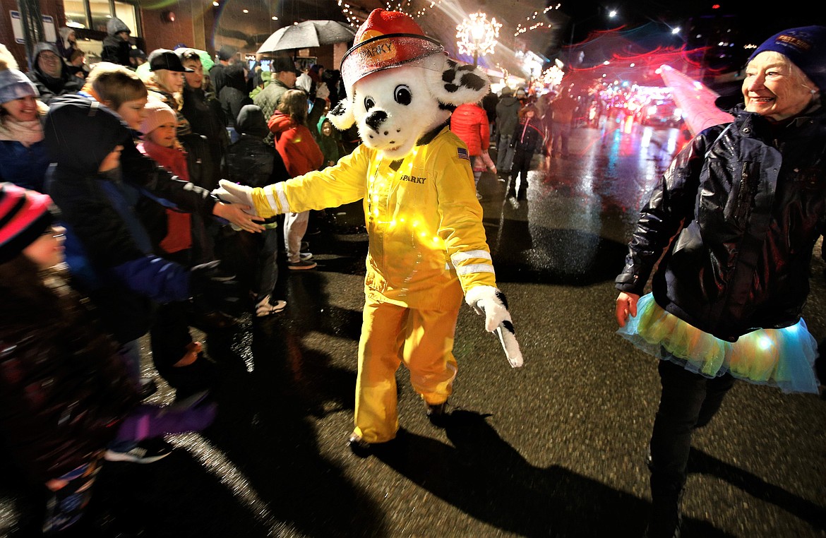 Despite a rainy, windy and cold night, thousands of children and adults lined downtown Sherman Avenue for the parade, and then made their way to the lawn of The Coeur d’Alene Resort for the 35th annual Coeur d’Alene Resort Holiday Lighting Ceremony that included a spectacular fireworks show.