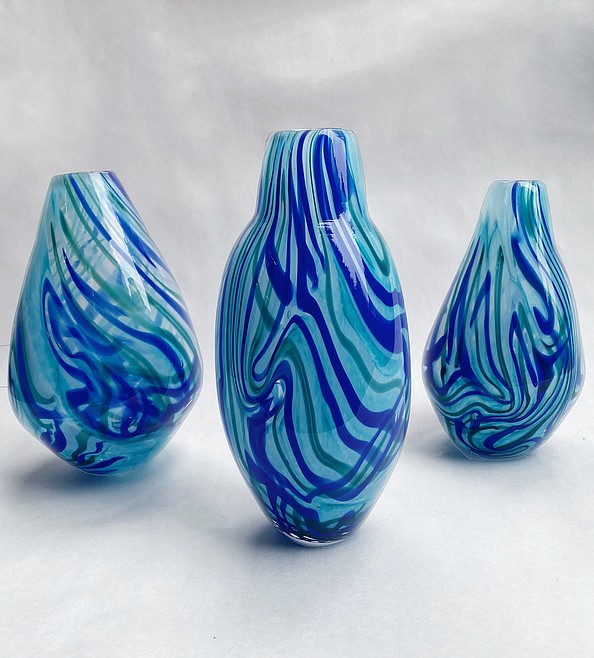 “These vases are representations of the winding journey I have recently been experiencing, Chepenik said. “These pieces were made at Pilchuck Glass School, which prompted my travel to see and experience the country. It has been the trip of a lifetime and, while some parts of the journey were daunting, I turned to the sky in each state for comfort. It made the world seem familiar knowing I was looking under, nearly, the same sky.
