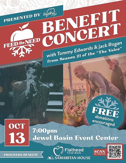 Feed the Need, a benefit concert to help offset food costs this winter for the Flathead Food Bank and Samaritan House, will feature live music by Local musician Tommy Edwards and Jack Rogan, who both appeared on season 21 of NBC’s hit television show “The Voice.” The concert will take place Thursday, Oct. 13, at the Jewel Basin Center in Bigfork.