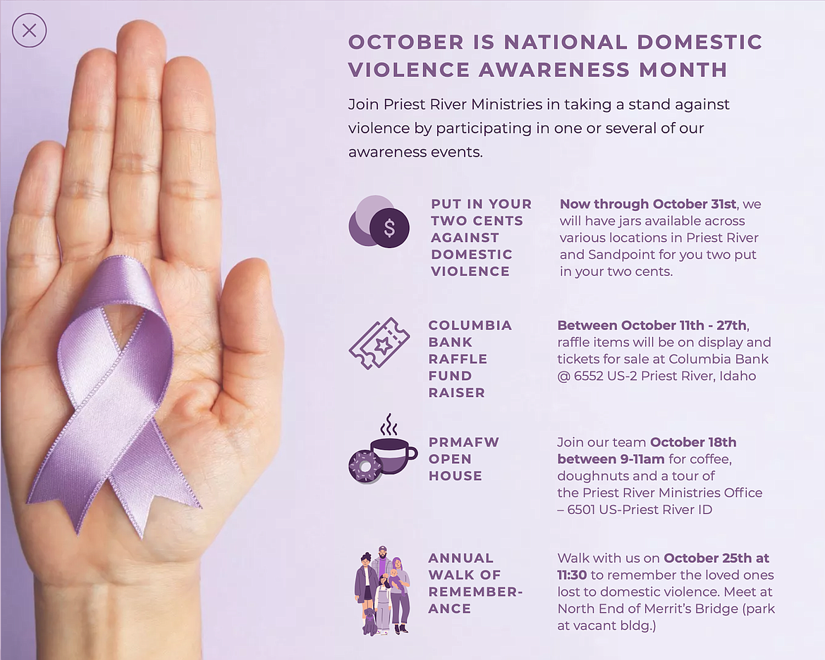 Starting Oct. 11-27, raffle items will be on display and tickets for sale at the Columbia Bank in Priest River. Oct. 18, Priest River Ministries is hosting a meet and greet with coffee, doughnuts, and a tour of their Priest River facility from 9-11 a.m. at 6501 U.S. 2 in Priest River. Oct. 25 is the walk of remembrance for loved ones who have died due to domestic violence. The walk will begin at 11:30 a.m. on the north side of Merritt’s Bridge.