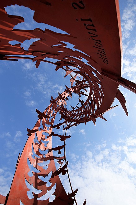 The art, created by Ai Qiu Hopen of Humanity Memorial, Inc., based in Sutton, W. Va., depicts two ribbons of birds swirling upward.