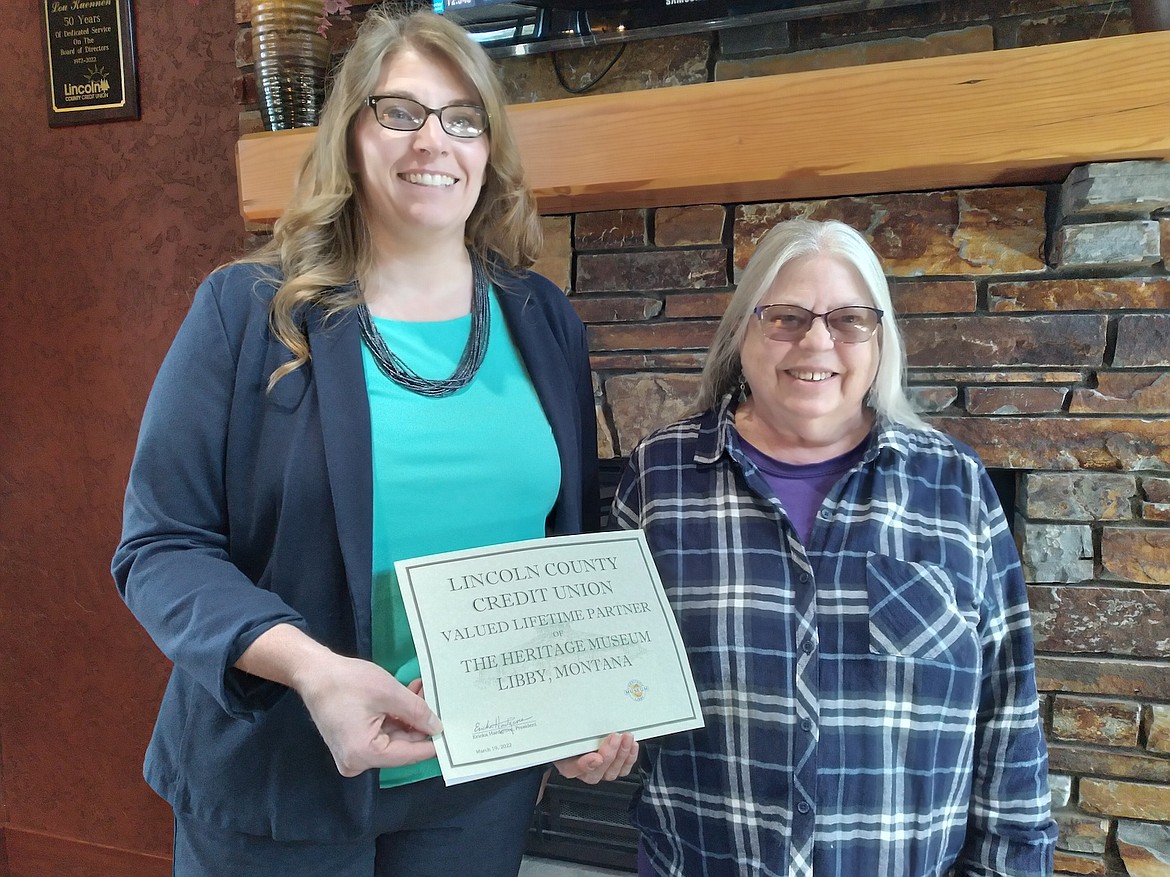 Heritage Museum Membership Chair Maggie Harmon, right, recently presented a Lifetime Partner Membership Certificate to Lincoln County Credit Union President Lindsay Beaty. The Museum's membership drive is currently underway. For those who are interested in becoming a member, contact the museum at [email protected] or 406-293-7521. (Courtesy photo)