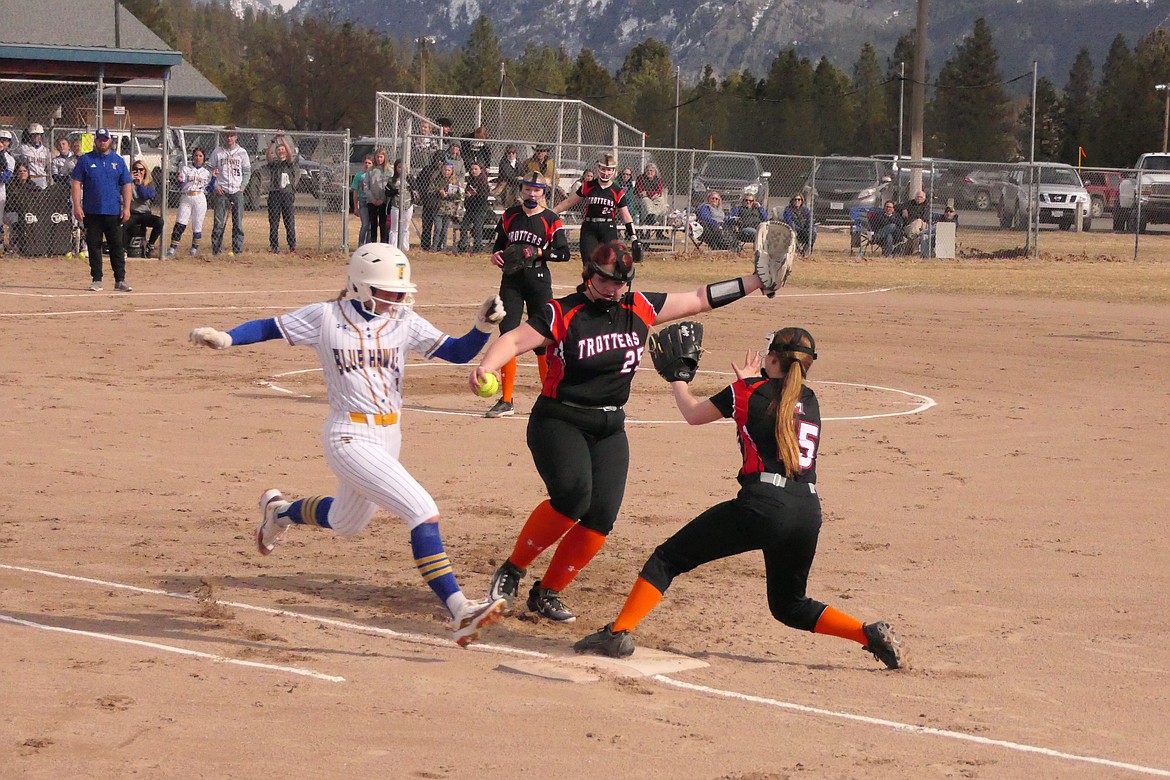 This year the Lady Hawks, on their home field, scored three runs in the bottom of the first, then added four more in the second to take a 7-0 lead. This time around Thompson Falls was getting some timely hitting in support of sophomore pitcher Olivia Fitchett, one of several young and promising pitchers on the fast-pitch roster.