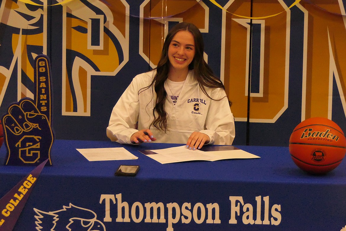 The latest top-level athlete from the bi-county (Sanders and Mineral) area to put her name to a scholarship offer from the Helena based college is Thompson Falls senior standout Ellie Baxter, who signed a letter of intent to play basketball for the Lady Saints next year.