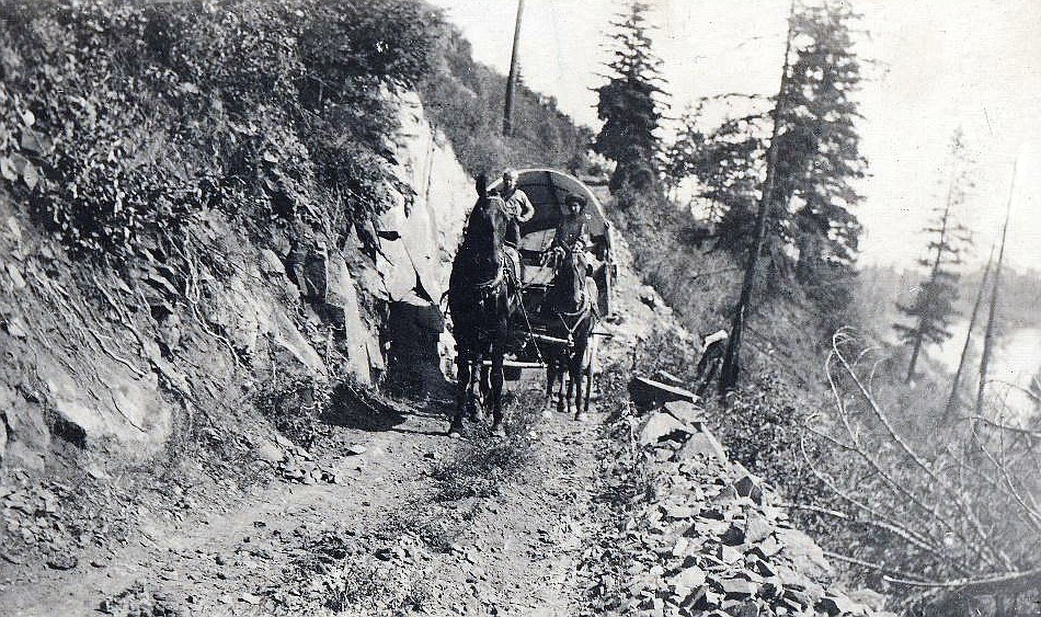 To that end, in two previous articles it was discussed how early travelers had to first use ferries, and then later and now, several bridges to travel around Bigfork. The old steel bridge figures in many stories about how people first experienced the village. And as has also been discussed, because the roads, or more aptly wagon tracks were rough in the late 1800s and early 1900s, many people came by steamship. But that isn’t to say ground-based routes were non-existent.