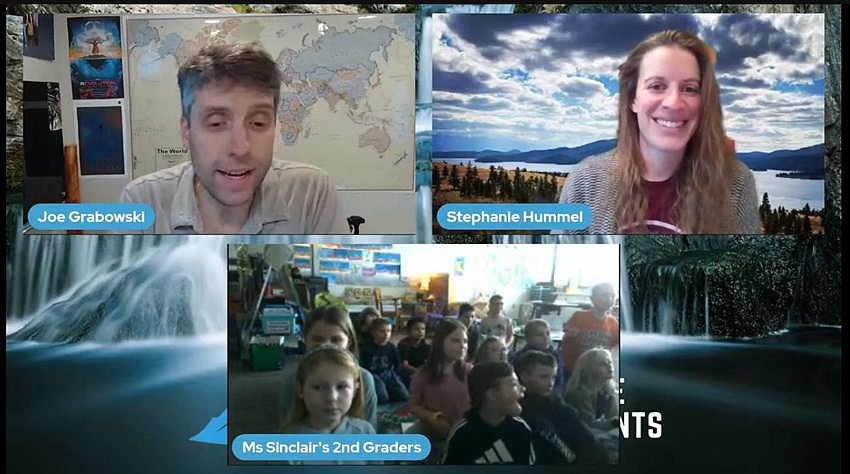 The format of the program is a cross between a Zoom meeting and a television show. Exploring by the Seat of Your Pants host Joe Grabowski welcomes all of the classrooms that have logged onto the event, which includes Ms. Sinclair’s second graders from Kalispell. He then hands the show over to Stephanie, who provides an overview of the Bio Station and the Flathead Watershed via an online camera and virtual presentation.