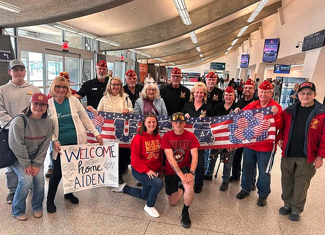 Members of the Marine Corps League Pappy Boyington Detachment 966 welcome home Aiden Cline of Priest River, front, kneeling, at the Spokane Airport as he returns April 15 from boot camp at the Marine Corps Recruit Depot in San Diego. He is joined by his mom, Kelli Cline, kneeling next to him, as well as loved ones and fellow Marines.