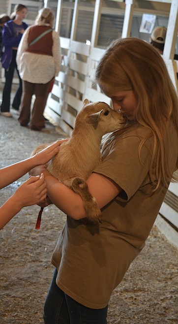 Nearby, in the goat shed, Caitlyn Wheeler was also dancing while holding her 8-week-old baby goat. Many of the show goats in the space were more social since it helped draw in visitors looking to learn more about the animals, while the animals themselves appreciated the extra love and attention.
