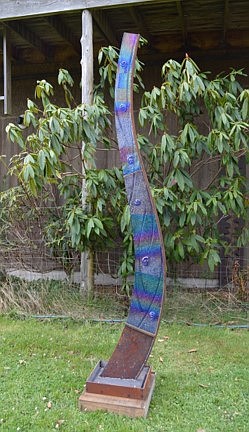 “Blue Spire” Artist: Gerry Newcomb, $4,500. “By marrying the steel with the glass, I’m using it in a more plastic way so it seems to become a fluid material and the two materials work closely together. I want the glass to look as ‘structural’ as the steel.”