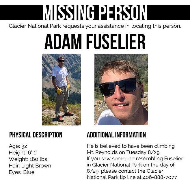 Park officials ask that if anyone saw a person resembling Fuselier in Glacier National Park on Aug. 29 to contact their tip line at 406-888-7077.