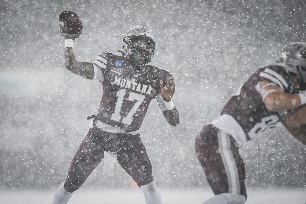 Grizzlies quarterback Clifton McDowell (17) drops back to pass in the second quarter against Delaware at Washington-Grizzly Stadium on Saturday, Dec. 2. (Casey Kreider/Daily Inter Lake)