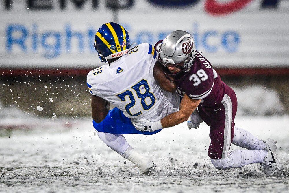Grizzlies cornerback Jace Klucewich (39) tackles Delaware running back Saeed St. Fleur (28) on a run in the fourth quarter at Washington-Grizzly Stadium on Saturday, Dec. 2. (Casey Kreider/Daily Inter Lake)