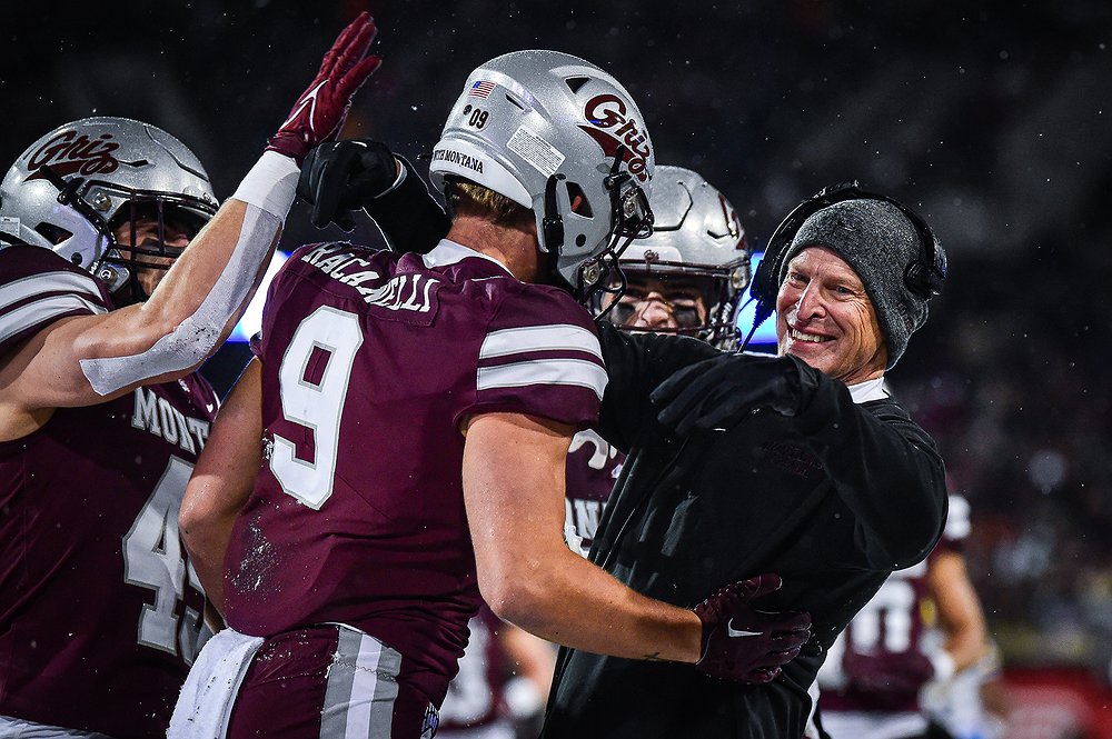Grizzlies head coach Bobby Hauck congratulates Sawyer Racanelli (9) after Racanelli blocked a punt in the first quarter against Delaware at Washington-Grizzly Stadium on Saturday, Dec. 2. (Casey Kreider/Daily Inter Lake)
