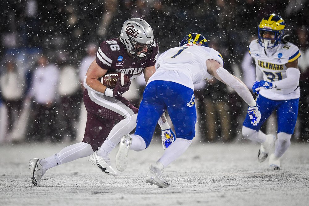 Grizzlies running back Nick Ostmo (26) picks up yardage on a run in the first quarter against Delaware at Washington-Grizzly Stadium on Saturday, Dec. 2. (Casey Kreider/Daily Inter Lake)