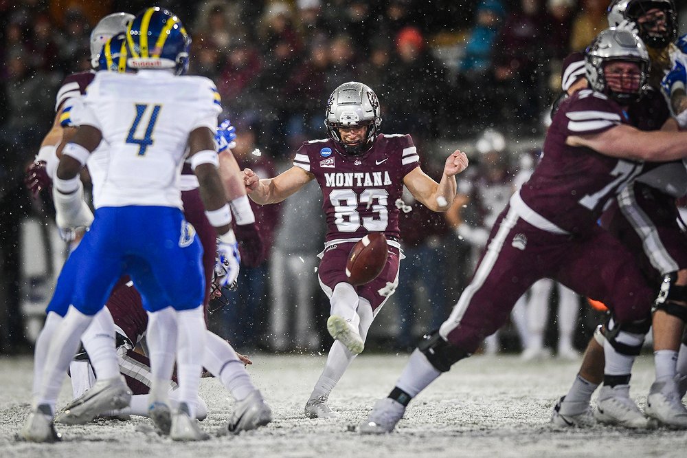 Grizzlies kicker NIco Ramos (83) kicks a 43-yard field goal in the first quarter against Delaware at Washington-Grizzly Stadium on Saturday, Dec. 2. (Casey Kreider/Daily Inter Lake)