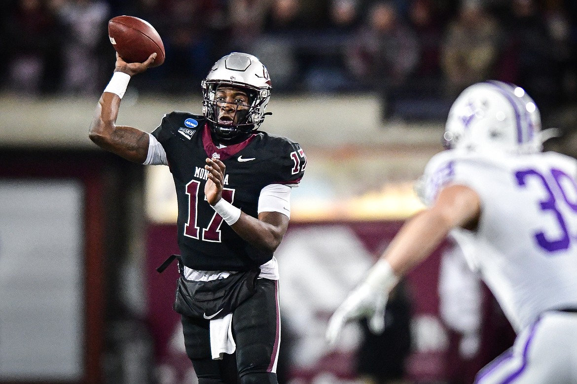 Grizzlies quarterback Clifton McDowell (17) completes a 9-yard pass to wide receiver Junior Bergen in the first quarter of an FCS Playoff game against Furman at Washington-Grizzly Stadium on Friday, Dec. 8. (Casey Kreider/Daily Inter Lake)Casey Kreider