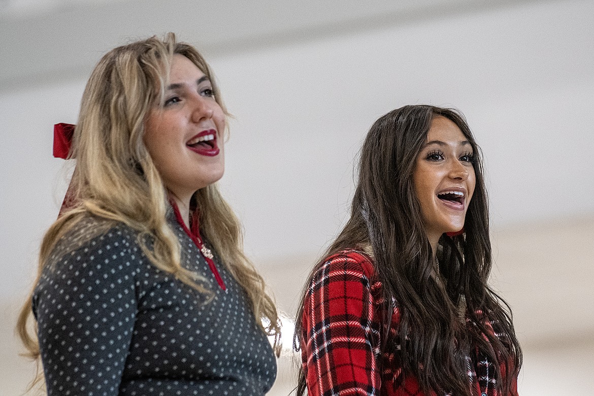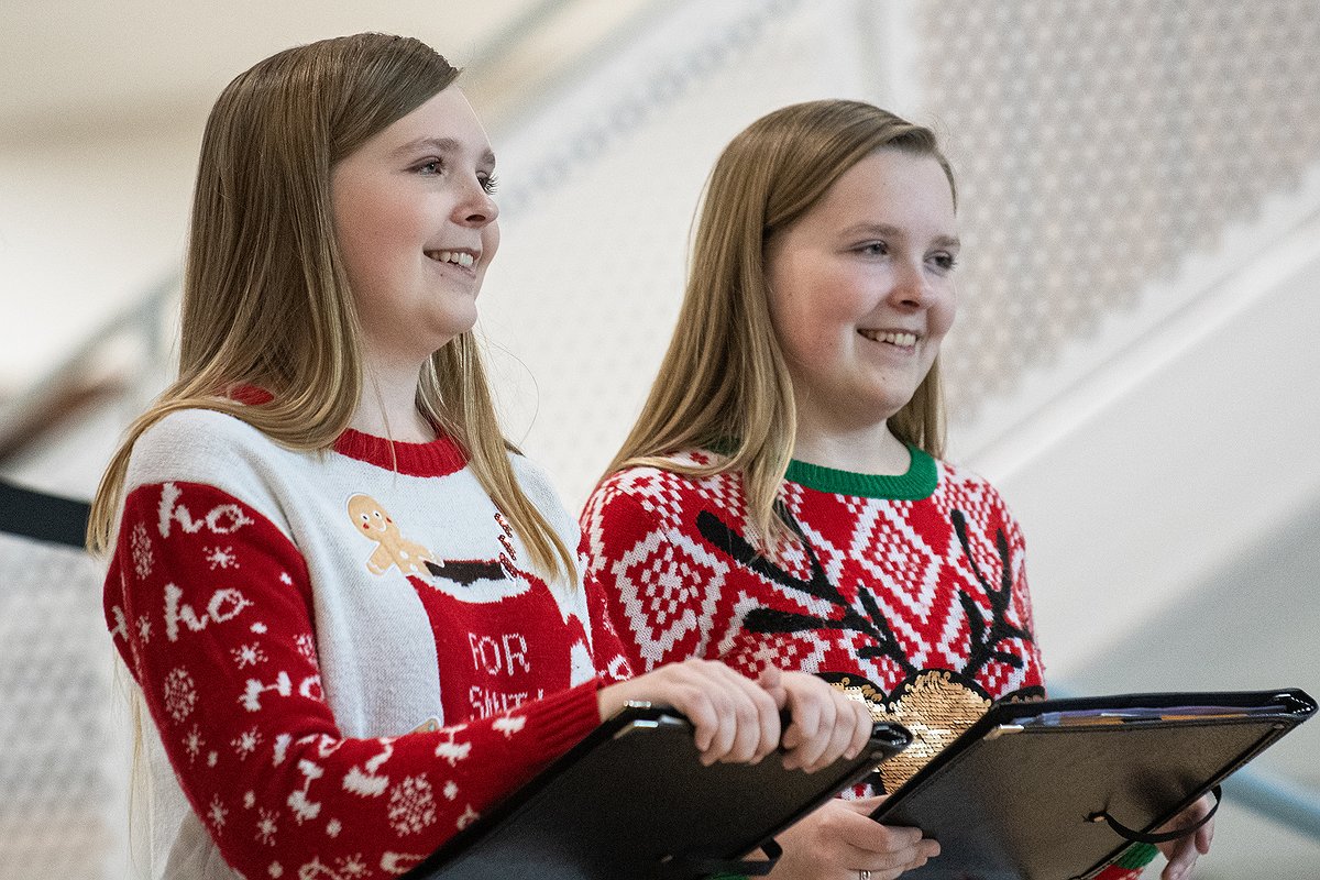 Amanda and Isabella Fitch smile to the audience at Glacier Gateway Elementary while caroling with the Sonifers on Wednesday, Dec. 6. (Avery Howe photo)