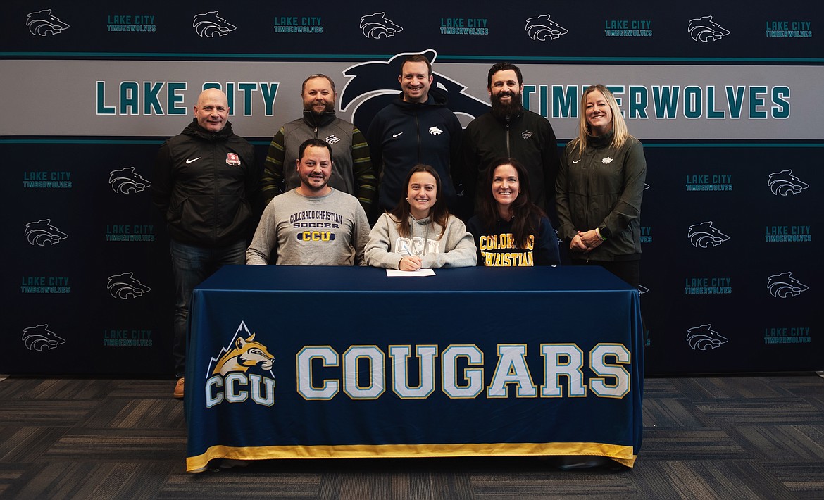 Courtesy photo Lake City High senior Gabbie Henkle recently signed a letter of intent to play soccer at NCAA Division II Colorado Christian University in Lakewood, Colo. Seated from left are Sam Henkle (dad), Gabbie Henkle and Megan Henkle (mom); and standing from left, Mark Plakortus, club soccer coach; Matt Ruchti, Lake City High head girls soccer coach; Troy Anderson, Lake City High athletic director; Nik Bjurstrom, Lake City High assistant girls soccer coach; and Laura Tolzmann; Lake City High assistant girls soccer coach.
