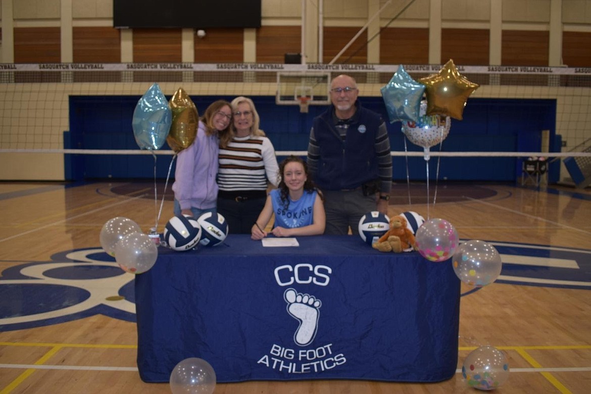 Courtesy photo Olivia White, who played in the Mountain Christian League at North Idaho Christian School from grades 8-11, then played her senior year for the Kootenai Thunder homeschool group, recently signed a letter of intent to play volleyball at the Community Colleges of Spokane. From left are Isabelle White (sister), Amie White (mom), Olivia White and David White (dad).