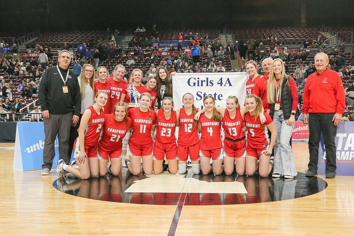 The 2022-2023 Sandpoint High girls basketball team is all smiles after winning the schools' first-ever, boys or girls, 4A state championship last year. Players, back row, from left, Daylee Driggs, Karlie Banks, Kelsey Cessna, Peyton Cessna, Livia Owens, Jetta Thaete. Front row, from left, Demi Driggs, Maggie Bleckwenn, Chloe Laybourne, Aliya Strock, Lily Richardson, Taylor Mire, Aubrey Knowles, Alex David.WHAT HAPPENED: Sandpoint, in its first appearance in the state title game since 1996, went on a 14-0 run in the third quarter, and held off the top-seeded Shelley Russets 69-65 to win the state 4A championship.