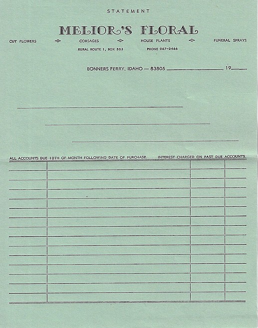 In 1946, with a loan from the Veterans Administration, Wallace and Winnie Melior purchased Freddie’s greenhouse west of town. They named the business: Melior Floral and Greenhouse. Wallace planted and tended to the crops, while Winnie took care of the shop and floral arrangements. During the 1948 flood, the Meliors moved the greenhouse stock to the North Bench. Forced to move again in 1954, Harold and Eula Sims offered the Meliors a lot next to their home near Valley View School.
