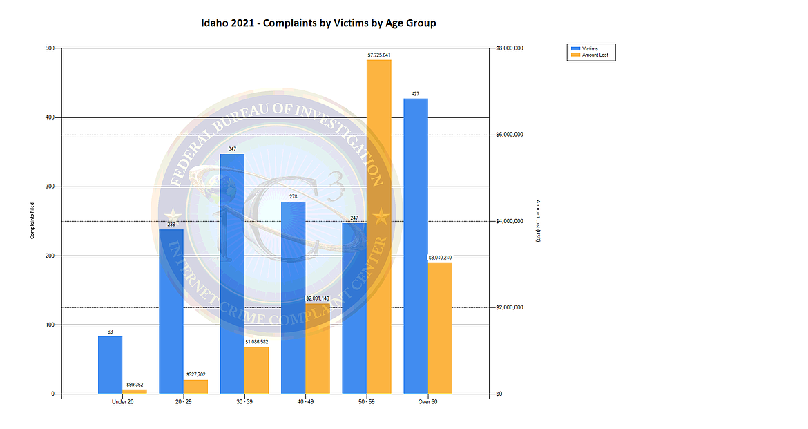 Idahoans over the age of 60 made up the bulk of the victims, with 427 people reporting crimes to the Internet Crime Complaint Center. Combined, they lost around $3 million to internet crimes.