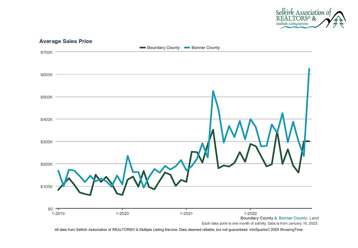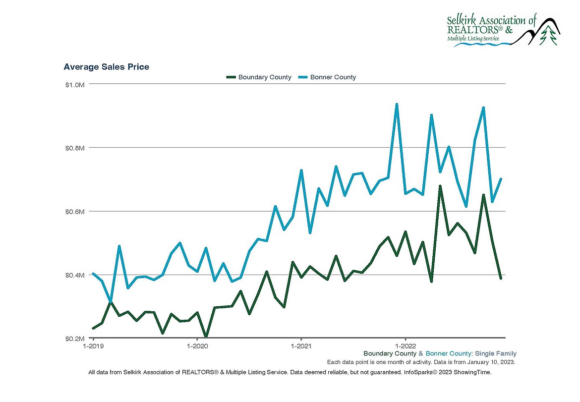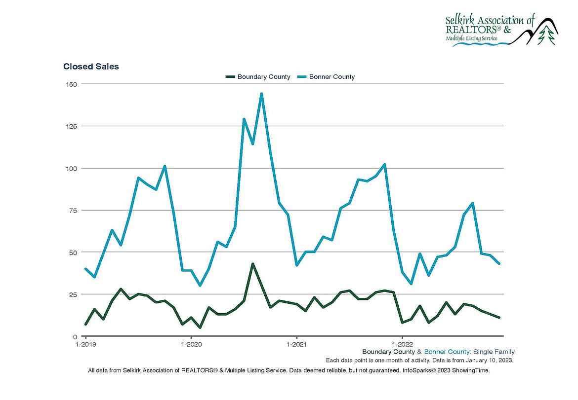 I've included a few interesting charts prepared by Brent Stevens of Century 21 Riverstone. The charts represent the past four years' activity in the Selkirk Association MLS which includes both Bonner and Boundary County. I looked at the data for the Coeur d’Alene MLS area and it tracks these graphics as well, the same erratic movements, but at four times the scale given the larger market.