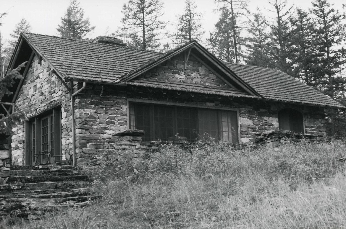 Mrs. Martha Evans helped design and oversaw construction of the Rock House in accordance with the special-use permit stipulations which stated that the structures had to be designed and located in such a manner that they blended with the natural environment. The nomination paperwork notes that, Ward B. Whitney, Art’s father, was the master carpenter in charge of construction while William “Billy “ Moose served as the mason. Given that the material was rather heavy, transportation was kept to a minimum and the rock used to construct the residence was “locally sourced” from a large rock outcrop 3 miles south of Three Rock Point. The stones were then barged to the site, lifted off with a gin pole, and placed on a “go-devil” tramway. Horses were then used to pull the “go-devil” up the hill to the site of the residence. Most of the reaming construction materials were purchased at the Kalispell Mercantile and barged from the north end of lake to the construction site. The house itself, is nothing grand or super opulent, consisting of a bedroom, bathroom, kitchen, and sunken living room. The stone walls themselves are likely a schist or a similar material with an average thickness of 12 inches. The walls, except for the bedroom interior, are also left exposed. This nakedness also allows visitors to see that the stone is roughly cut with some stones showing the peen hammered or tooled surface marks of the laborers that quarried the stones. While the material was heavy, given the relatively small dimensions, construction of the Rock House and associated buildings was completed by the spring of 1930 and Evan’s put the buildings into immediate use that first summer. However, while the Rock House served more as a retreat from the normal extravagance found at Kootenai Lodge, the young Mr. Evans apparently had little interest in the Rock House as the special-use permit was transferred to his mother, Martha, by 1932. One of the annual events though that took place at the Rock House was a party held for