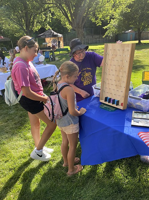 Barb King and Heidi Salvador helped him set up the table, which also included a peg and chip game as part of an interactive element to invite people over.