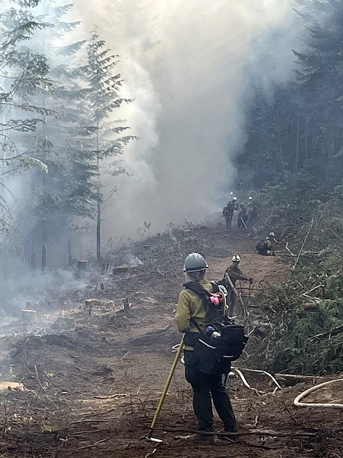Klamath Interagency Hotshot Crews have spent the past two days building hand and saw lines around the fire's western flank, progressing from the bottom to the top of the mountain.