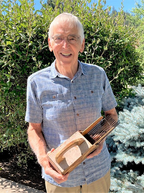George was holding the wooden huckleberry picker that Art crafted in a Coeur d’Alene High shop class in the 1930s. The tines are longer than the metal, commercial ones of today. But the picker enabled Art to reap pounds of huckleberries for the county Democrats’ annual huckleberry socials.