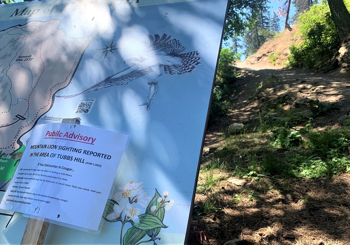 COEUR d’ALENE - The city of Coeur d'Alene has posted signs around Tubbs Hill warning people that a mountain lion was recently spotted in the area.