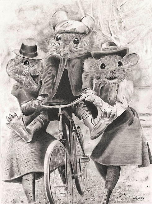 "I often begin by thinking about what type of animal I want to draw," Harrop said. "Then I look through old photos to suggest body type and clothing."