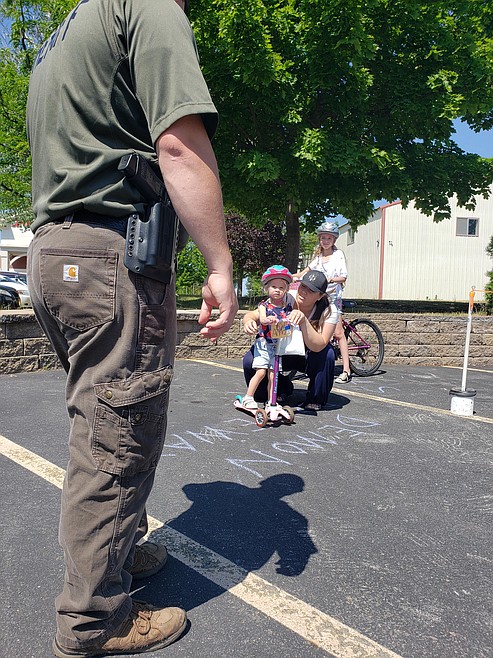 Deputy Tanner Cox of the Kootenai County Sheriff’s Office brought a scooter-riding Annabelle Losee, 4, to a screeching halt Wednesday in the Hayden Library parking lot.