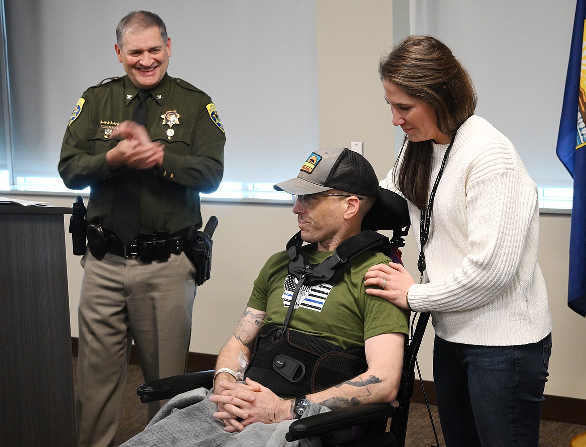 The occasion, a rally held in Johnson’s honor, also served as a moment to recognize the efforts of first responders and medical personnel who assisted in caring for him in the moments after he was struck by a fleeing vehicle near Eureka on Feb. 16. Sitting in the front row was one of his close friends, Deputy Clint Heintz of the Lincoln County Sheriff’s Office, who came to Johnson’s aid shortly after the collision.