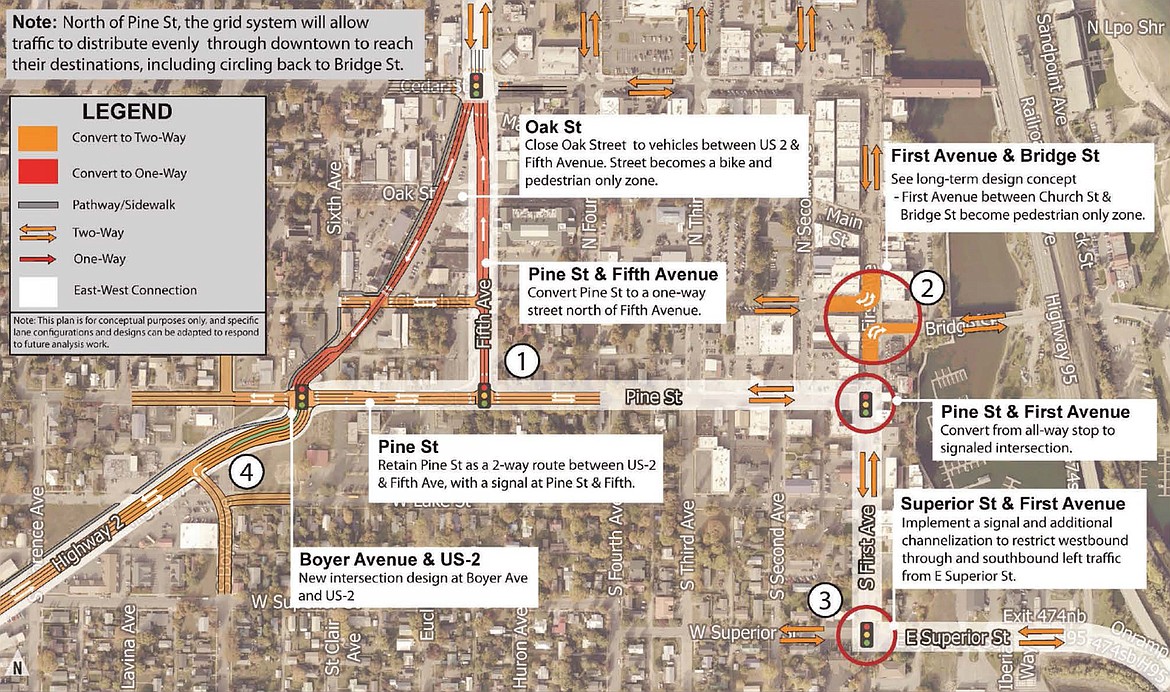 In the 2015 agreement, portions of First Avenue and Cedar, Pine and Superior streets used to move highway traffic through town were given back to the city's control to provide for two-way traffic. In exchange, the city agreed to accept that minimum performance levels on portions of the transportation may fall below acceptable levels.
