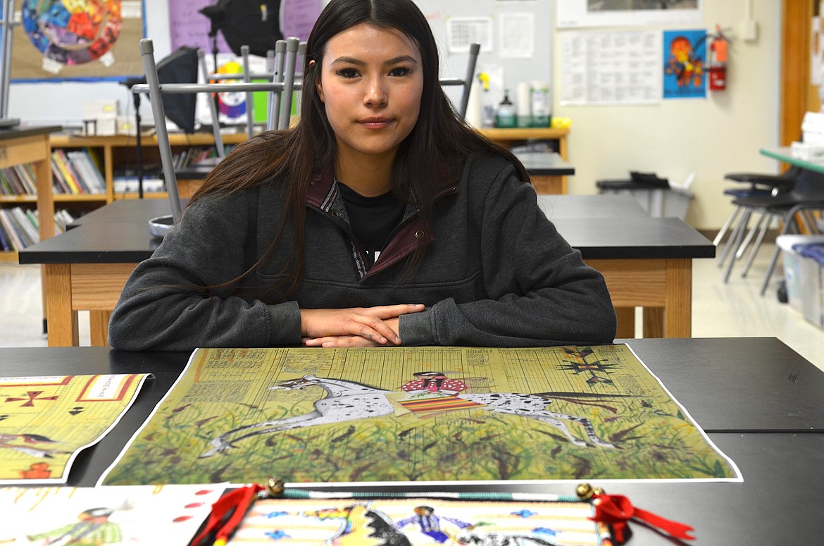 The high school senior creates ledger art, a form of narrative painting developed by Plains Indians in the late 19th century to depict their history using materials at hand – in this case the paper ledgers used at trading posts to document transactions.