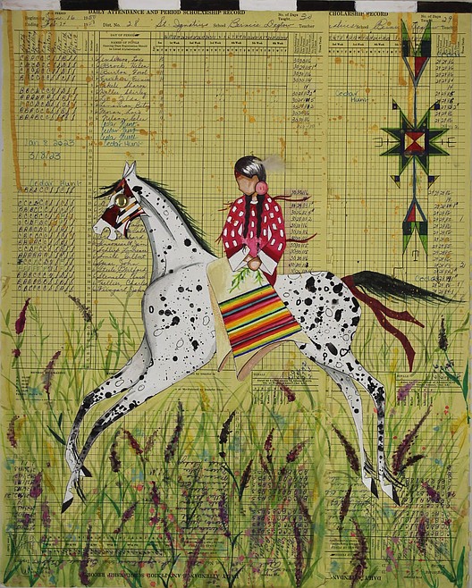 The painting is both sophisticated and unusual, in part because horse and its rider are floating off the page, giving it a three-dimensional quality. And instead of ledger paper, the backdrop to her painting is a school attendance sheet, dating back to the 1940s.