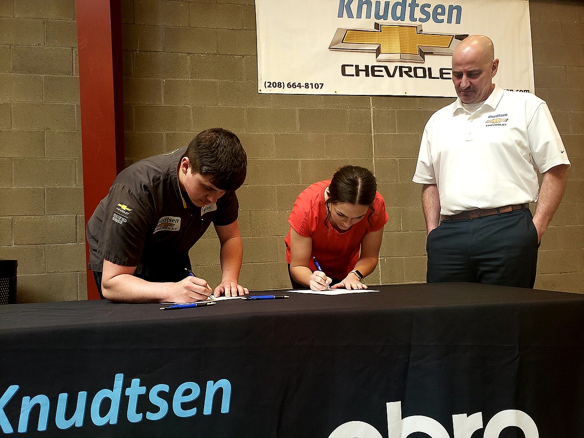 Tyler signed an agreement with Knudtsen Chevrolet to receive two years of 100% paid tuition for every A, 80% for each B and 40% for each C. Knudtsen will also pay room and board for training at College of Southern Idaho, where he’ll earn certification to be a maintenance technician. Knudtsen will also provide Tyler with tools. He'll have the opportunity to build a career with Knudtsen.