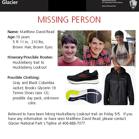 According to a press release issued by park officials, rangers are searching for 19-year-old Matthew David Read who was believed to have been hiking the Huckleberry Trail on Friday. Read is described as a White male, about 5-foot-11 in height and weighing roughly 210 pounds with short brown hair and brown eyes. He may be wearing a gray and black Columbia rain jacket with either blue and yellow or black and red shoes.