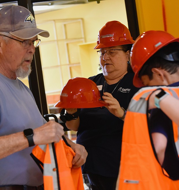 Library director Abbi Dooley brought library staffers Lizzy Jore, Maclaen Burningham, Angela Claver, Felicia Gill and Mallory Witham to the building to don shiny red hardhats and take a swing at the walls to launch the project. Also along for the momentous day was Connie Brownell, library foundation chair, and Allen Bone, library board member.